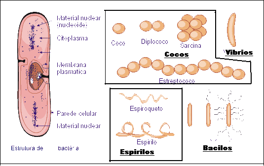 Las bacterias se reproducen muy rápidamente a través de un proceso llamado simple división o bipartición. Tienen diferentes formas: algunas son esféricas y se llaman cocos, otras son alargadas y reciben el nombre de bacilos, también las hay curvadas y se llaman espirilos.